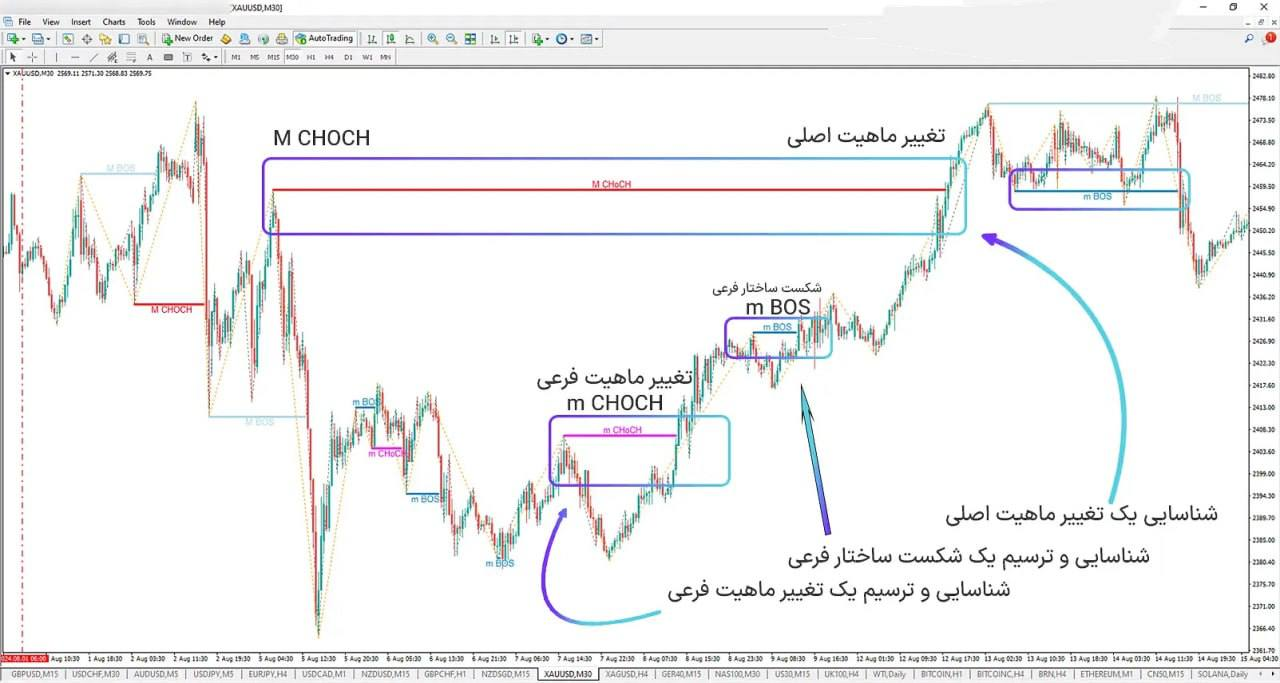 تحلیل تغییر ماهیت بازار: گام بعدی در تحلیل نمودار قیمتی بررسی وضعیت تغییر ماهیت بازار است که به تایید تغییر روند کمک میکند. تغییر ماهیت بازار به معنای شناسایی نقاطی است که در آنها روند بازار ممکن است تغییر کند. این مفهوم از اصول اصلی سبک اسمارت مانی (Smart Money) است. تغییر ماهیت زمانی شکل میگیرد که پس از یک شکست ساختار صعودی یا نزولی، کف یا سقفی که باعث شکست ساختار شده بود، دوباره شکسته شود.